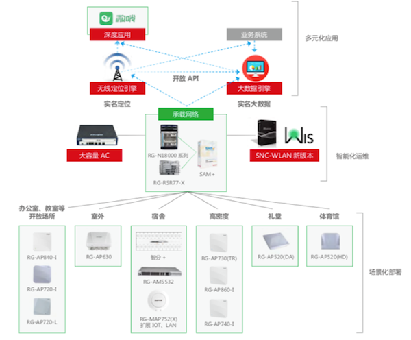 运用RG-SAM认证系统、RG-N18000(Newton)牛顿系列云架构核心交换机作为统一的认证网关,实现9万终端的并发和无感知认证,且能解决无感知仿冒带来的计费纠纷及实名制问题。